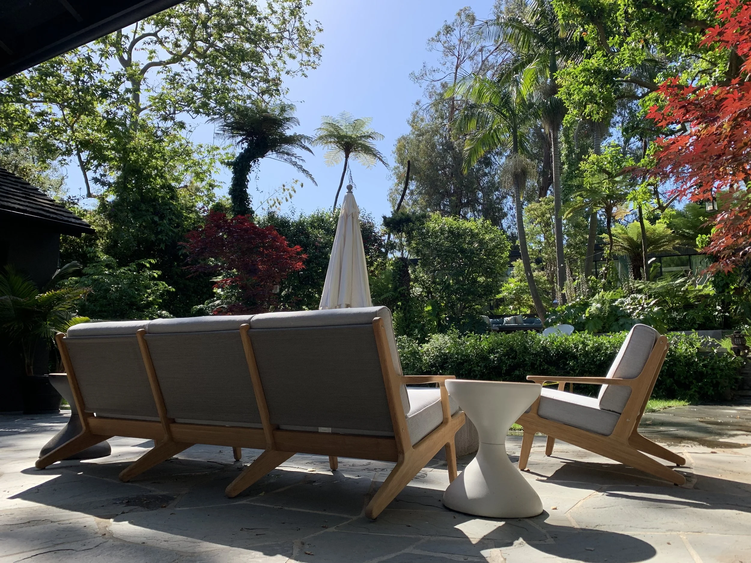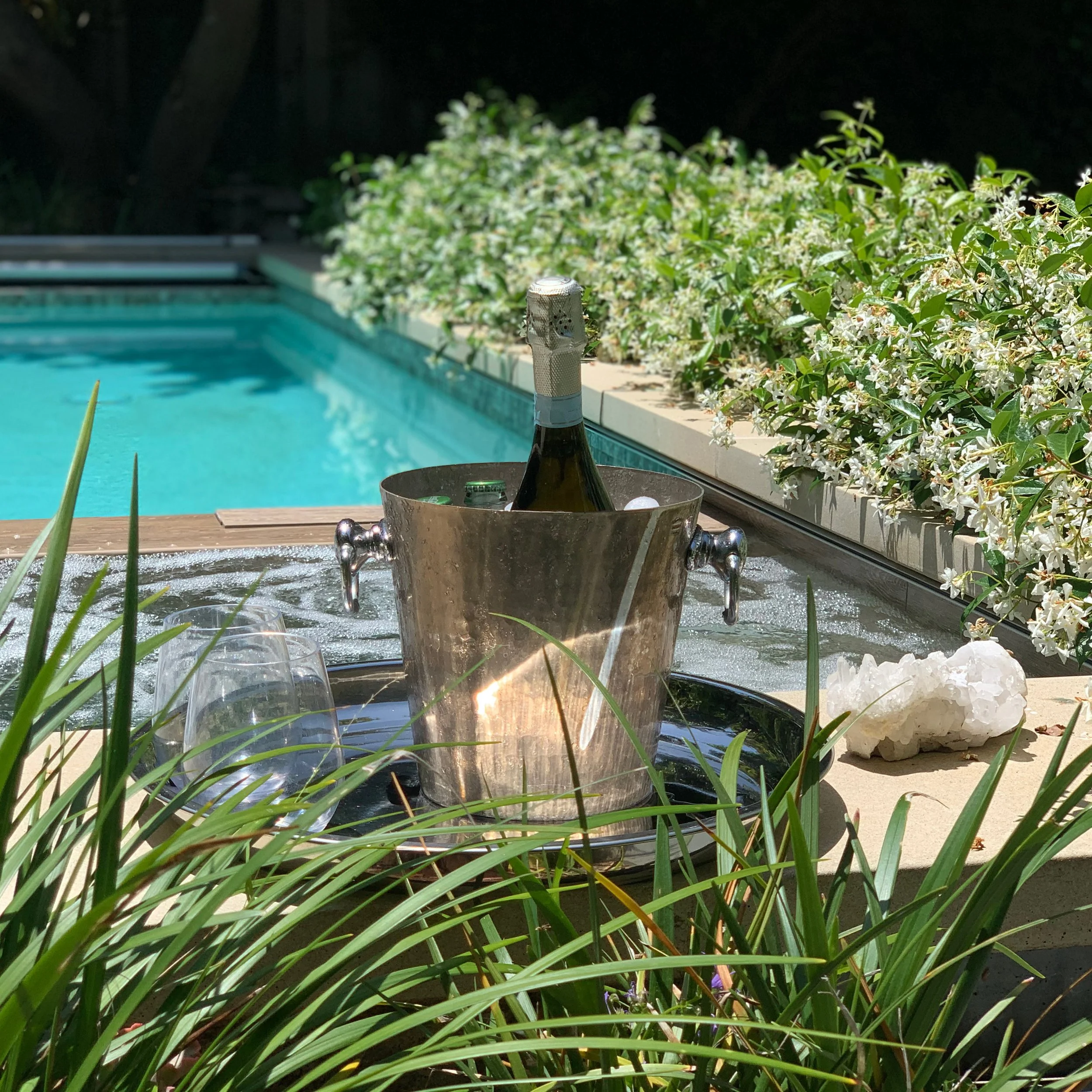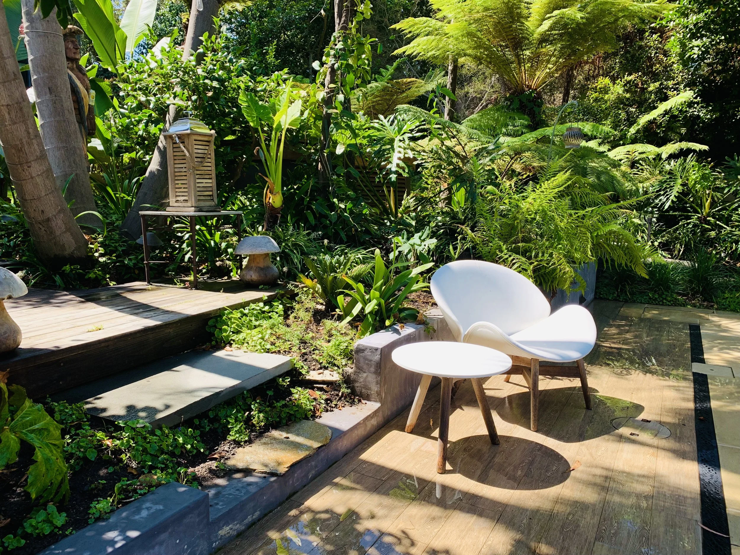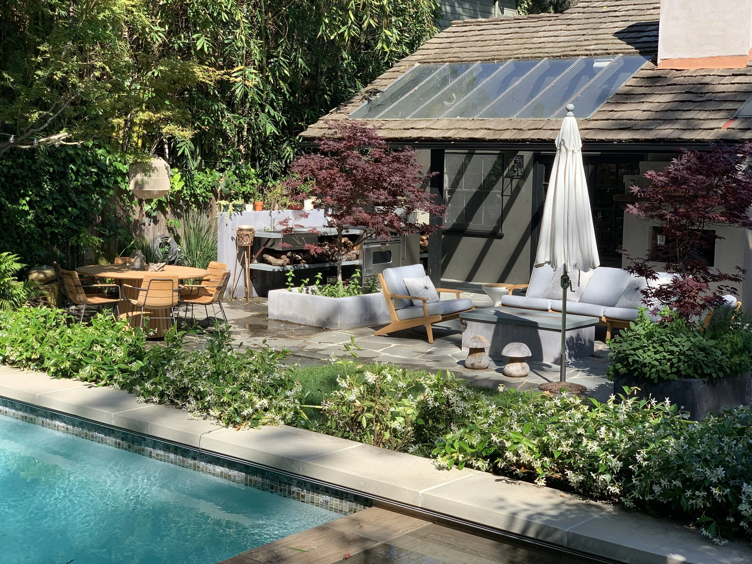 Lush Japanese inspired garden lies between main house and guest house. Spa , pool with swim jets, and outdoor shower and kitchen, fireplace and fire pit.